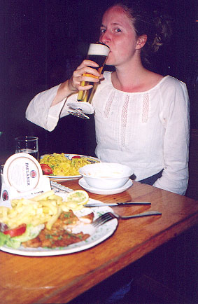 Ah, beer. Jamie actually sort of liked a swig of my Kirner Pils we had at lunch earlier this day, so she tried this Paulaner Pils. She did not like it as much as the Kirner. I enjoyed my plate of pork schnitzel and she had a unique dish of flour dumplings with cheese and onions.