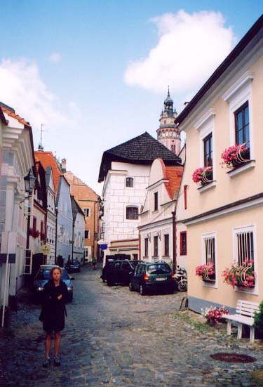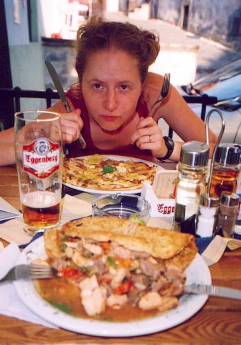 This was one of my favorite Czech meals. I had chicken, pork, and beef chunks marinated in some kind of sauce, with red, green, and yellow peppers, wrapped in a potato pancake. Man was it good! And the local Eggenberg beer was fantastic too. Jamie had a pizza that night.