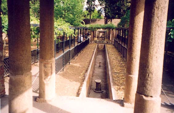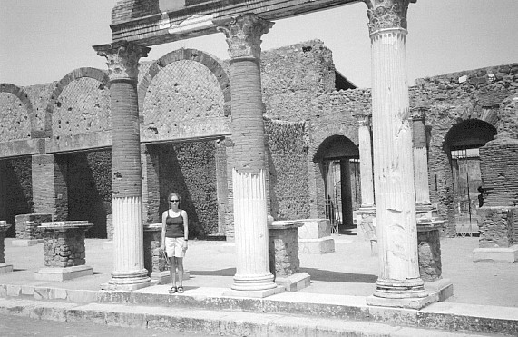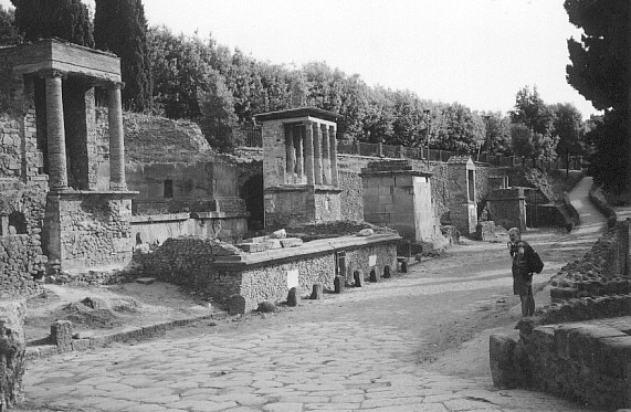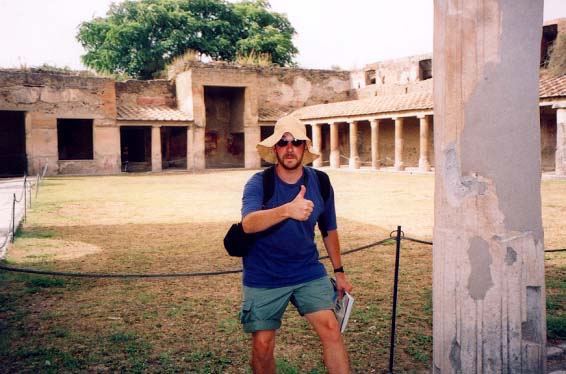 Some of the houses have been excavated and opened for visitor to see. Here is House of Octavius Quartio or of Loreius Tiburtinus (say ten times fast). It was one of the more elaborate ones we saw that included some still-visible wall paintings and this T-shaped canal (I'm standing over the top part of the T)..