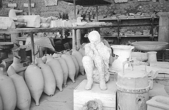 This is the famous cast of a victim of the exhalations of the eruption. He was probably trying to cover his nose in an attempt to be able to breathe when he was buried in ash. Around him is some of the collection of various artifacts from the site.