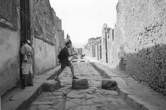 They had many of these stepping stones to allow people to cross the streets when it rained. Apparently the streets would be a muddy, impassable mess during those times. Here I bravely attempt to duplicate how an ancient Pompeian might have crossed during such a time.