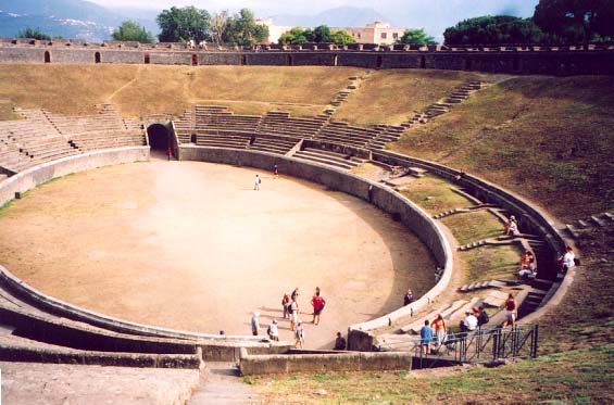 This is Pompeii's amphitheater, built in 80 BC. It is the earliest known amphitheater, so the book says. The first stone amphitheater in Rome was built in in 29 BC.