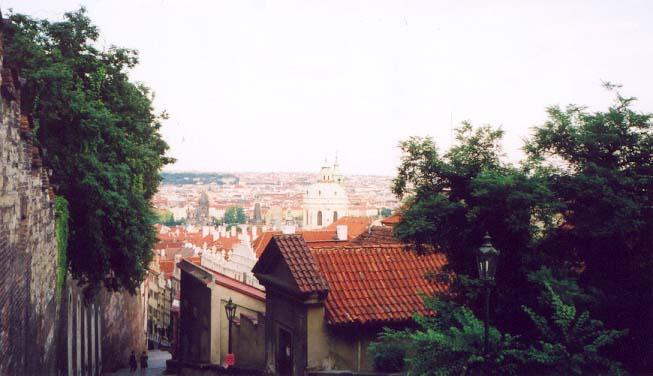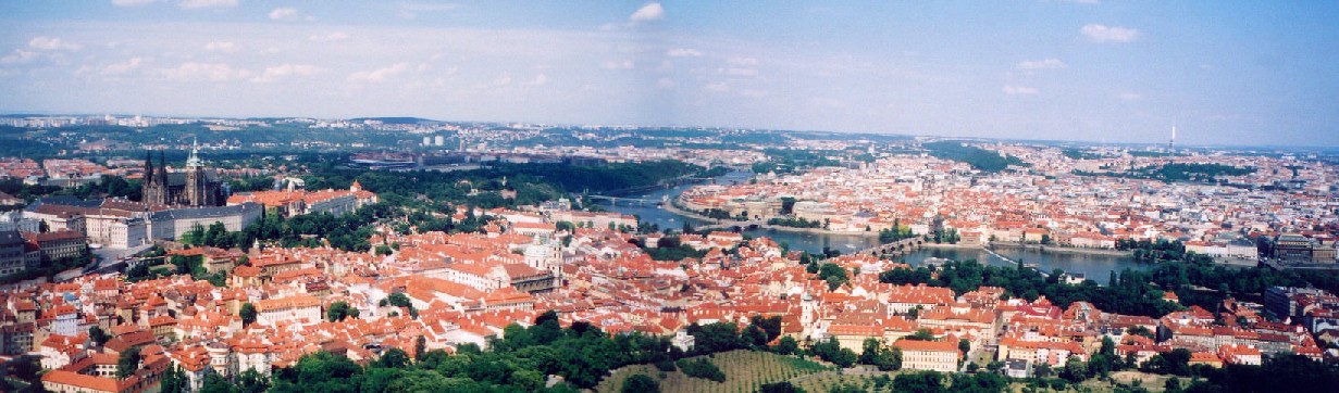 This is an attempt to roughly merge a couple pictures together to create a panorama. It was taken from a tower that was on top of a hill across the river from the old city center. You can see the castle at left and the town city center across the river at right.