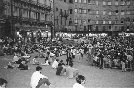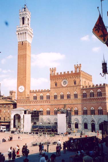 Piazza Il Campo, location of the famous horse race Il Palio. The Torre del Mangia clock tower looms. You can see a stage being constructed. The night after this there was a classical music concert. We sat in the piazza with thousands of others and listened into the night while taking sips of wine.