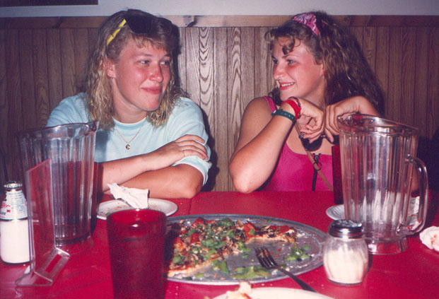 You can see Aric's shirtless overalls getup. Also, a bizarre and sad note. Sitting at right (green hat) is Dusty Sylte, a friend who died in a tragic car crash. And sitting at left (black muscle shirt) is the late Dan Schmelig, another friend who died tragically in a ski accident.